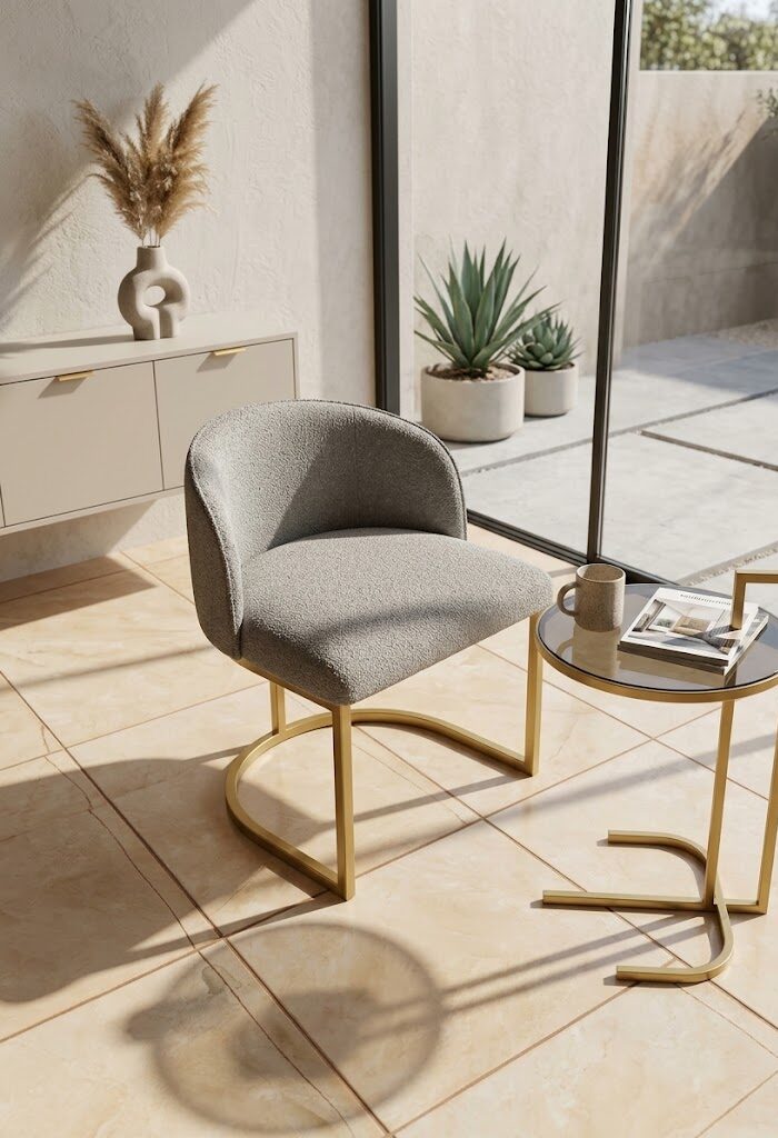 • Assento e encosto: Madeira com espuma e revestimento em Tecido Bouclé